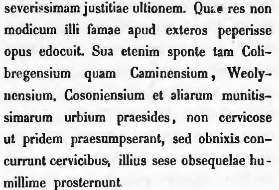 Sua etcnim sponte tam Colibregensium quam Caminensium, Weolynensium, Cosoniensium et aliarum munitissimarum urbium praesides, non cervicose ut pridem praesumpserant, sed obnixis concurrunt cervicibus, illius sese obsequelae humillime prosternunt.