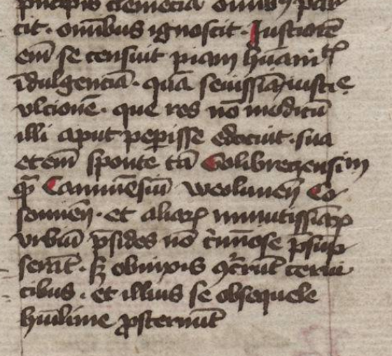Sua eteium sponte tom Colibregensim quam Camniesium Vueolunemn (Weolunemn) Cosonnemn, et aliarum munitissiarum urbium presises non ceruiose presupserant, sed osnixis querunt ceruicibus, et illius se obsequcse huisime prosternunt.